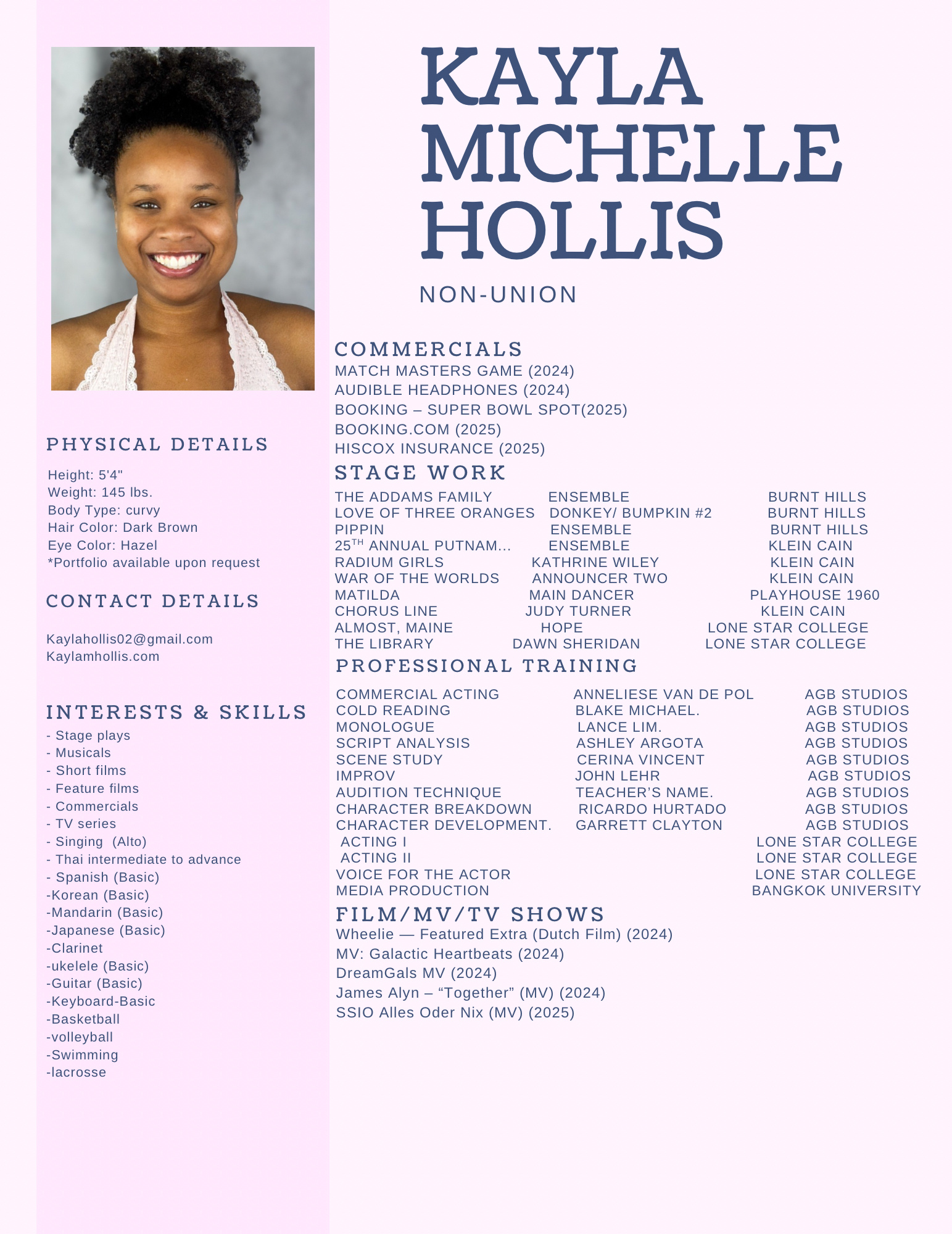 Hello, I’m Kayla Michelle Hollis, an aspiring actor with a deep passion for bringing stories to life on both stage and screen. With a solid foundation in theater, including roles in high school productions and community theater, I have honed my skills through diverse performances. Currently, I am expanding my experience in film and television, working on various international projects.My goal is to continue growing as a performer while contributing to productions that challenge and inspire both the audience and myself. Please feel free to explore my resume to learn more about my work and experience.