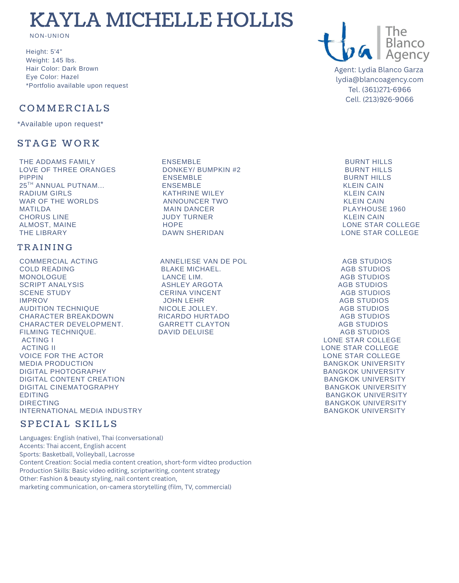 Hello, I’m Kayla Michelle Hollis, an aspiring actor with a deep passion for bringing stories to life on both stage and screen. With a solid foundation in theater, including roles in high school productions and community theater, I have honed my skills through diverse performances. Currently, I am expanding my experience in film and television, working on various international projects.My goal is to continue growing as a performer while contributing to productions that challenge and inspire both the audience and myself. Please feel free to explore my resume to learn more about my work and experience.